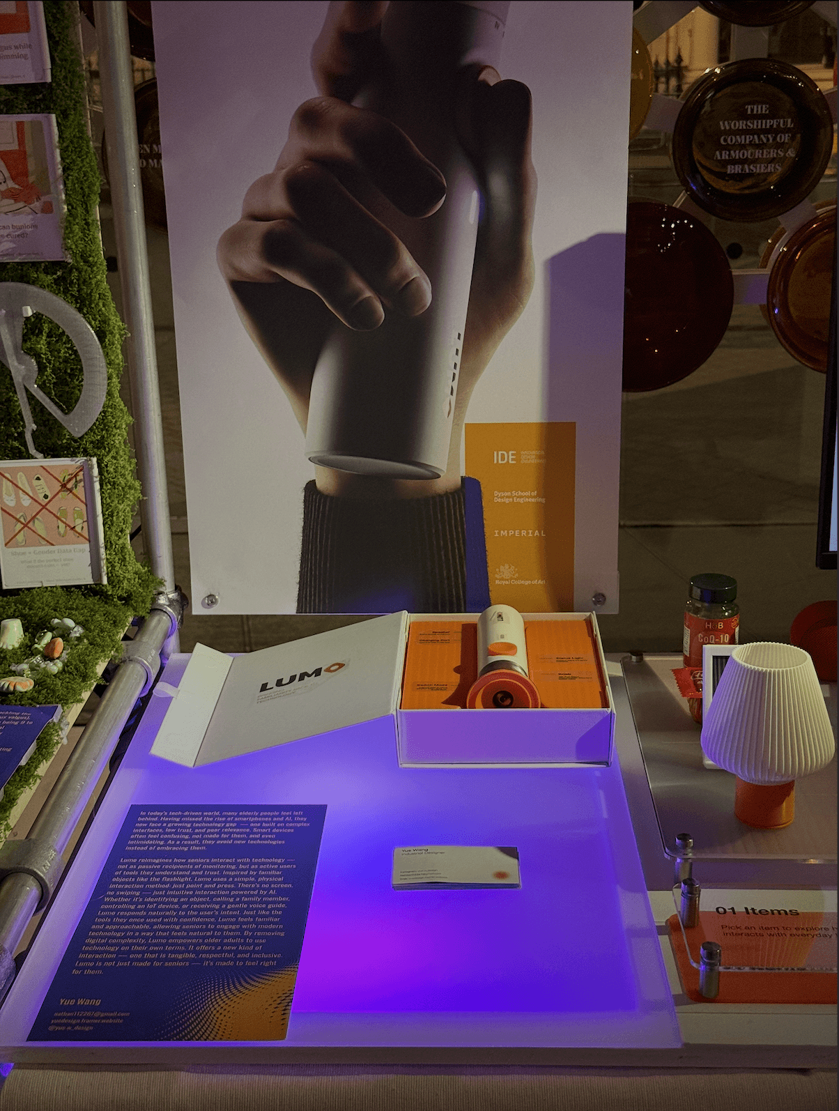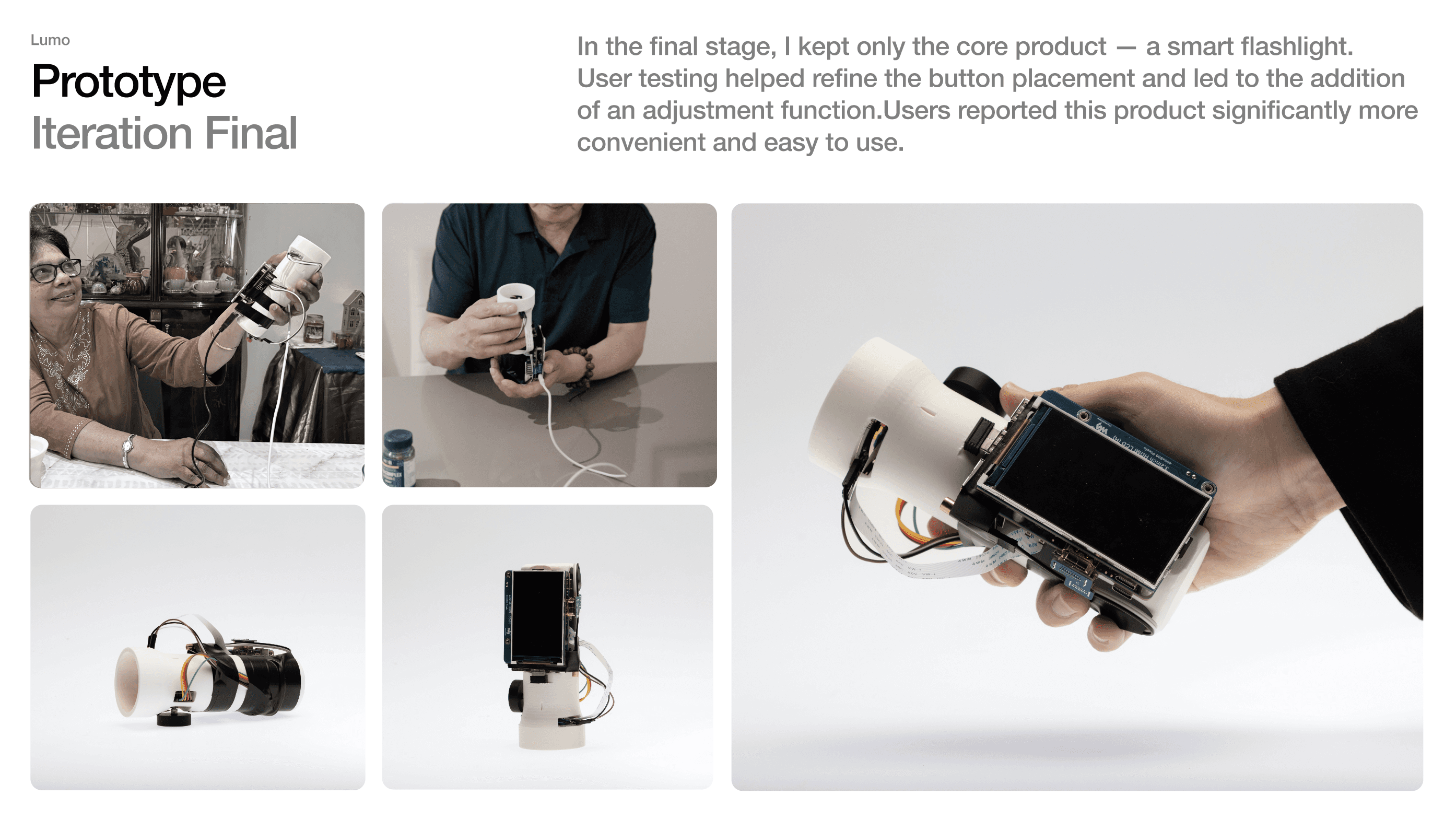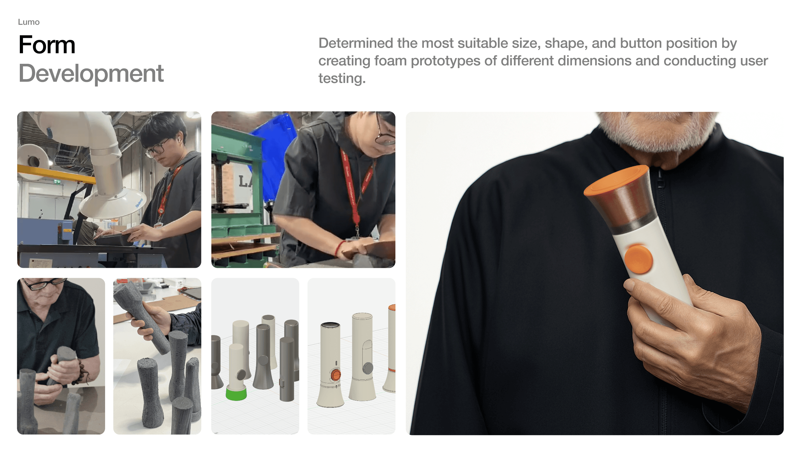 Designed in the form of a flashlight, Lumo leverages a familiar object to reduce learning barriers. A single-button interface minimizes cognitive load and enables intuitive, confident use for older adults.