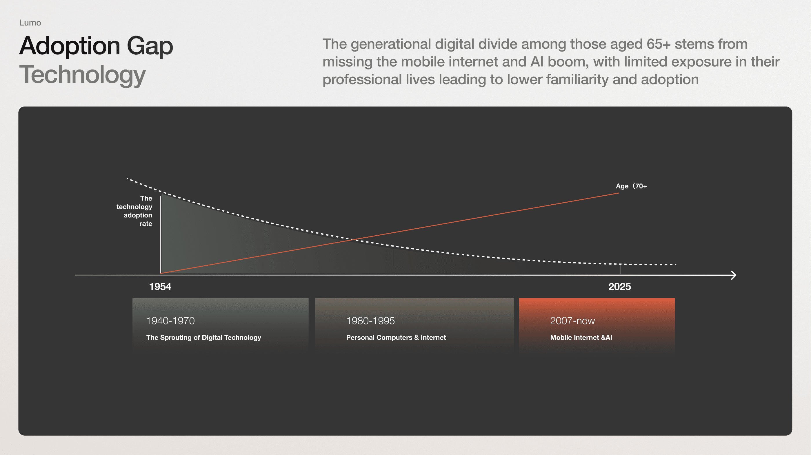 From a market perspective, most senior-oriented products focus on medical monitoring or simplified smartphones—addressing safety but not empowerment. There remains a clear gap for tools that allow older adults to actively engage with technology without needing to learn complex systems.