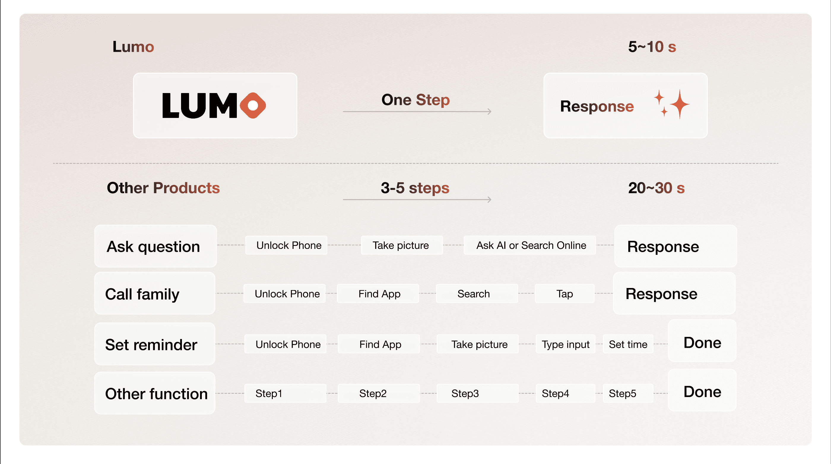 By introducing object-triggered AI interaction through a familiar physical form, Lumo offers a distinct alternative to voice-based assistants and simplified smartphones. This positions it uniquely in the market, bridging hardware simplicity with intelligent, context-aware software behavior.