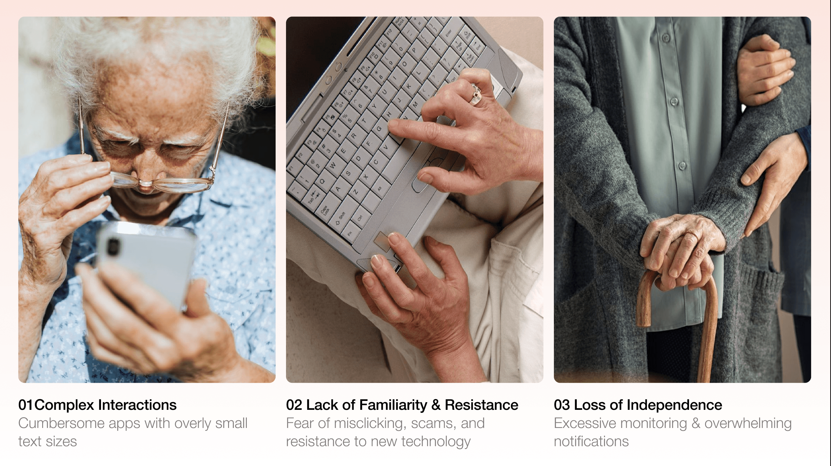User research reveals recurring pain points: anxiety around making mistakes, fear of scams, and confusion caused by small icons, layered menus, and app-based interfaces. Voice assistants, while accessible in theory, are often misinterpreted, unintentionally activated, and lack contextual clarity. As a result, many older adults depend on others for basic digital tasks, gradually losing autonomy and confidence.