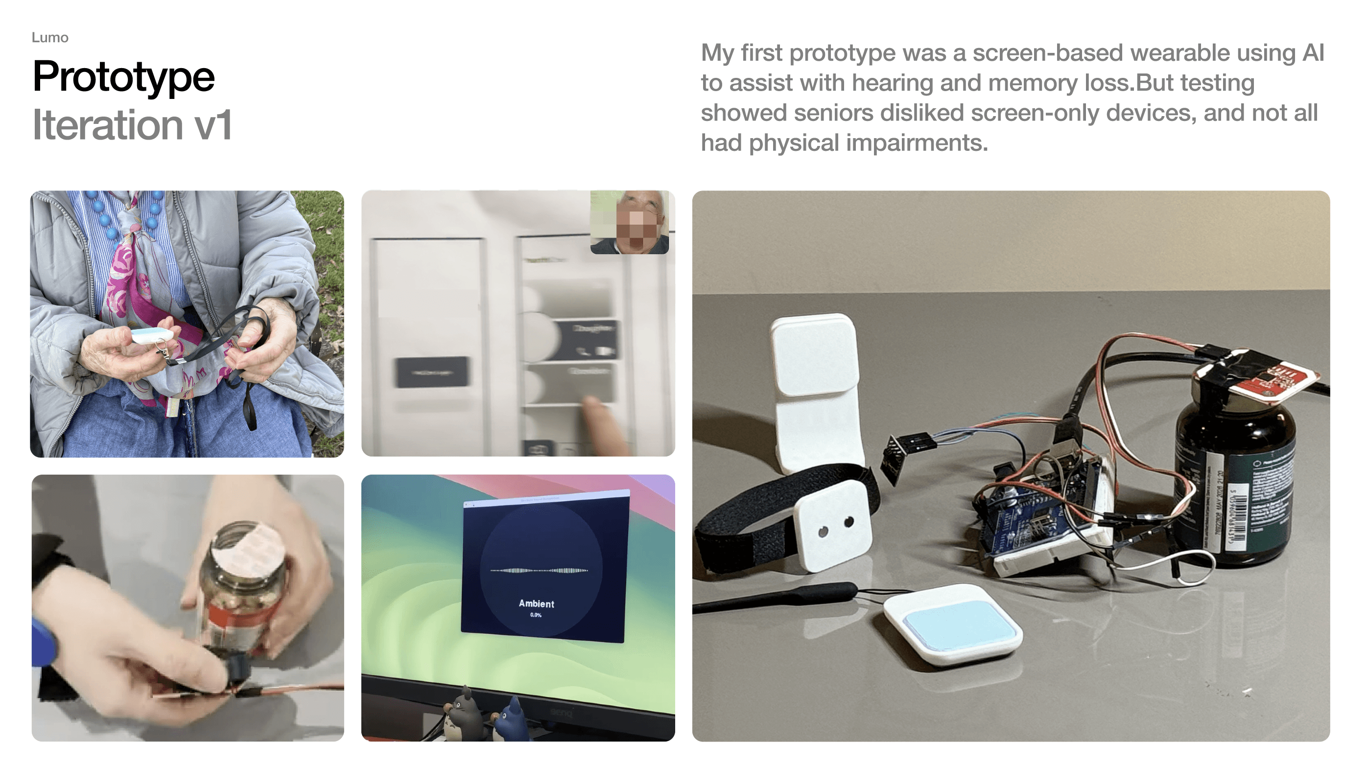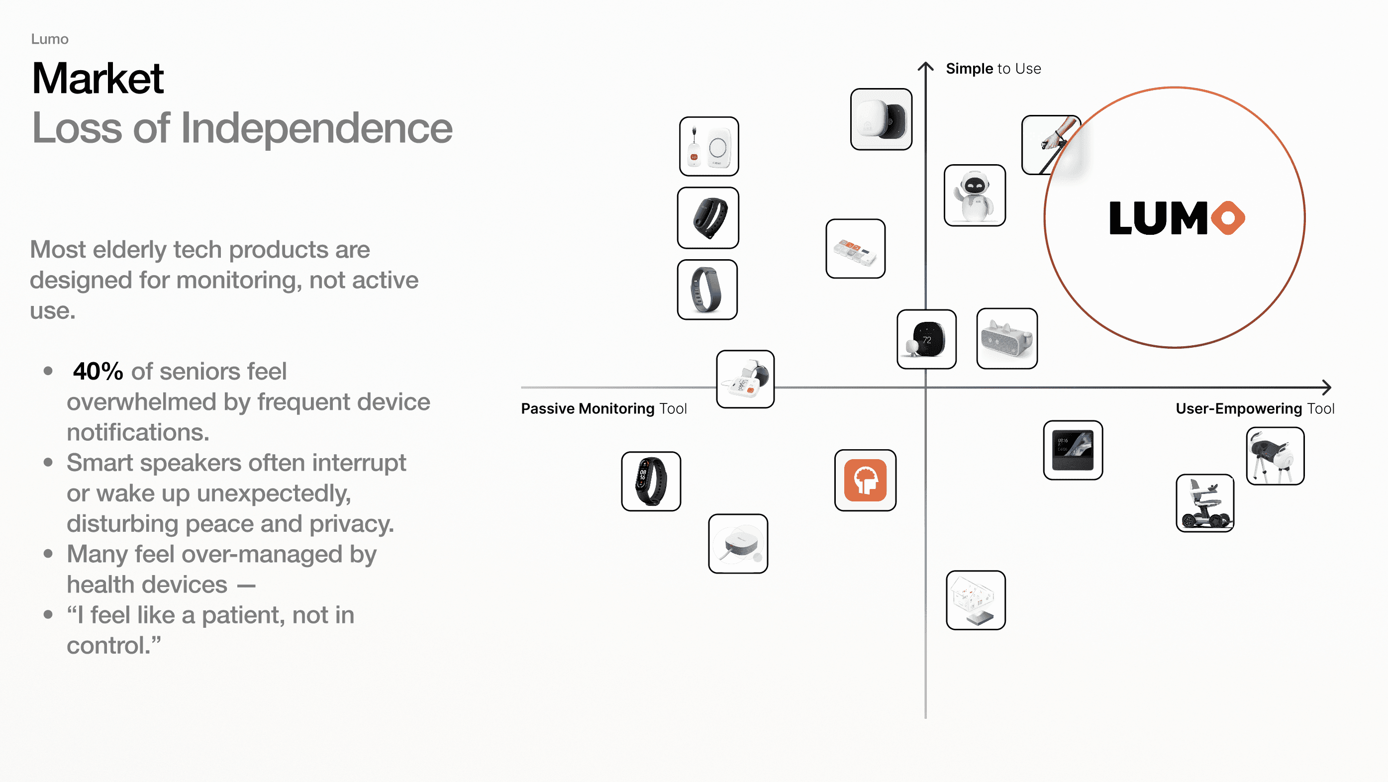 Unlike typical senior technologies focused on surveillance or alerts, Lumo is designed as a self-controlled tool. It empowers users to actively engage with technology, preserving independence and dignity rather than creating dependency.